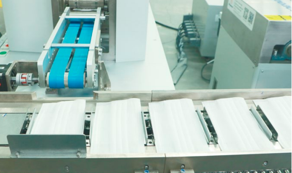 3.生產線采用全自動“一拖二”結構,面料通過打片機完成口罩打片后,通過傳送系統,自動分流輸送到兩套耳帶自動焊接加工工位。